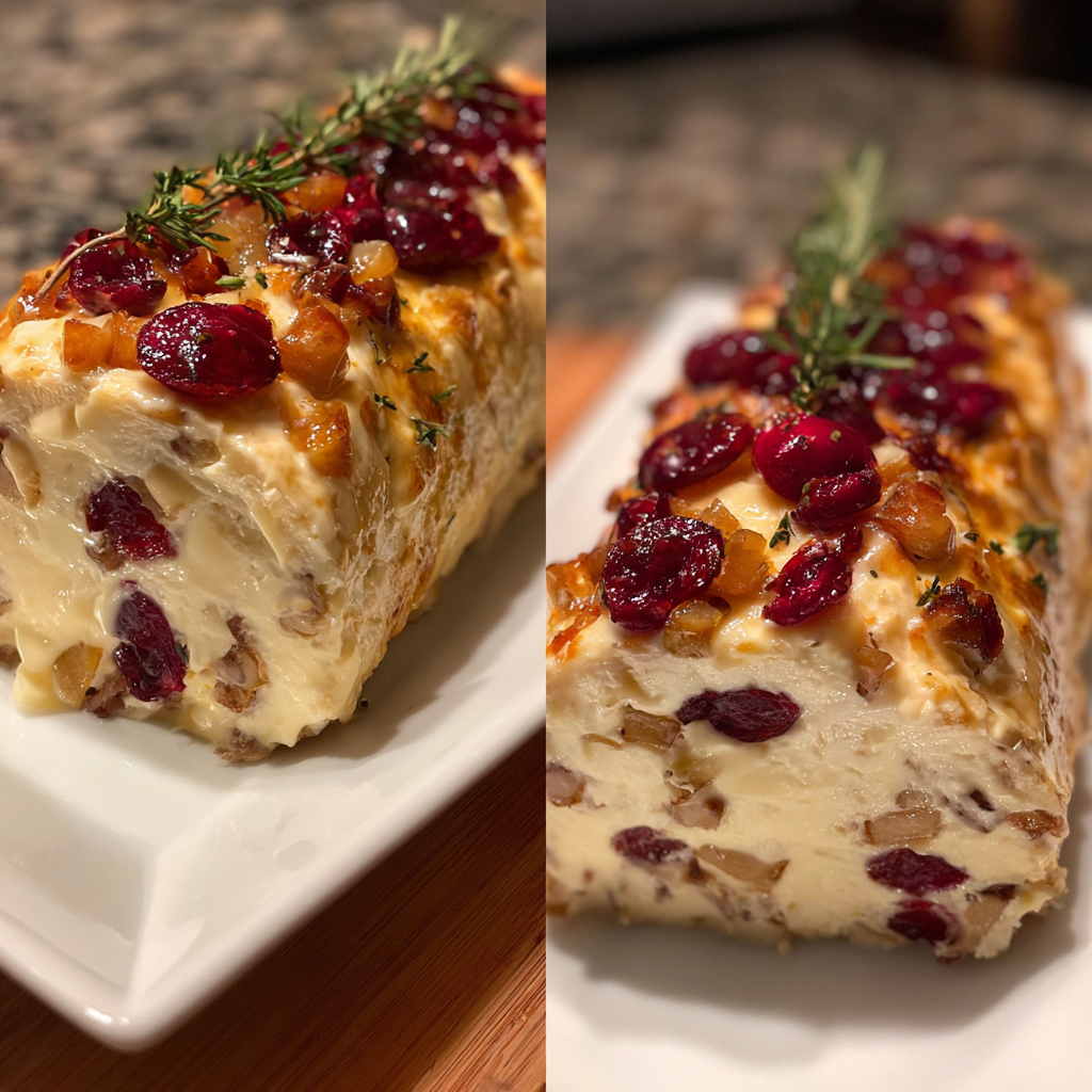 A festive blend of cream cheese, pineapple, cranberries, and nuts shaped into a holiday cheese log perfect for entertaining.