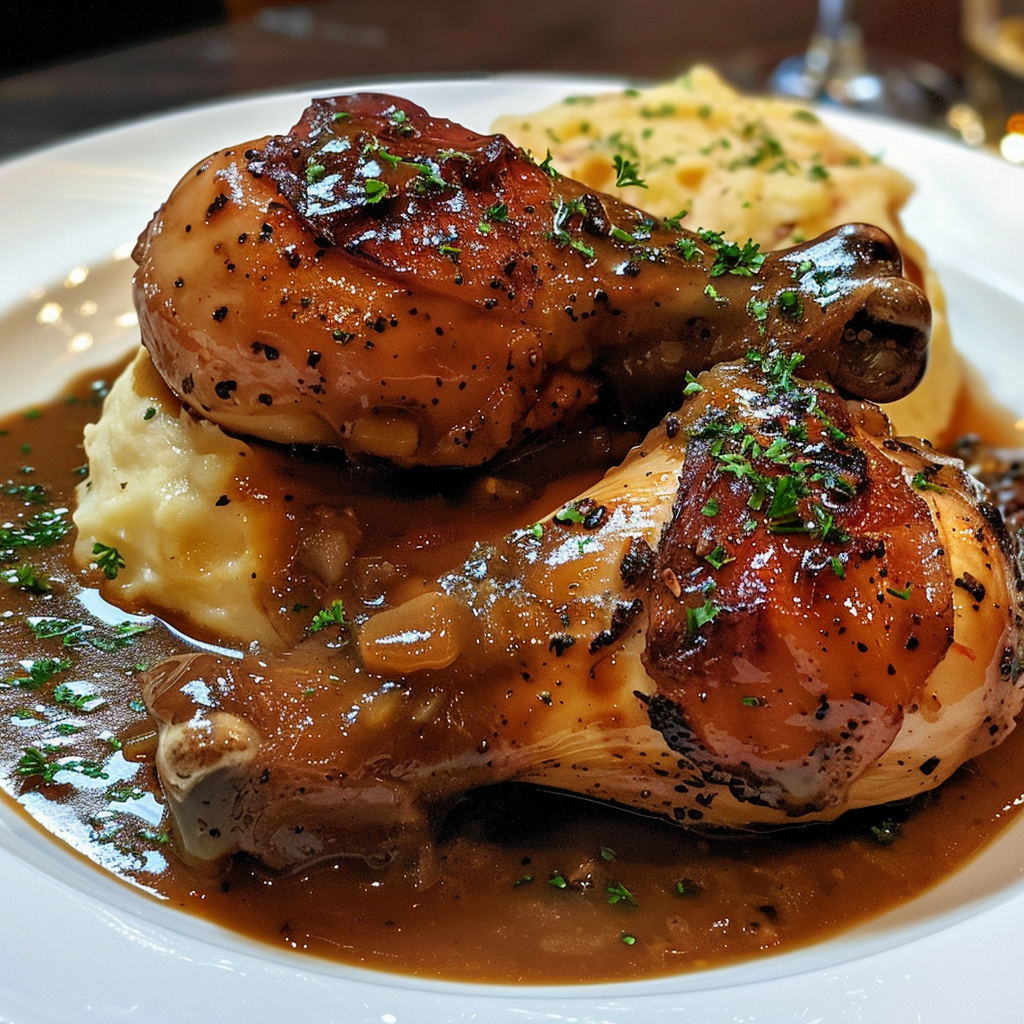 - Plate the drumsticks over a generous scoop of mashed potatoes and drizzle with warm gravy. Garnish with fresh parsley if desired.