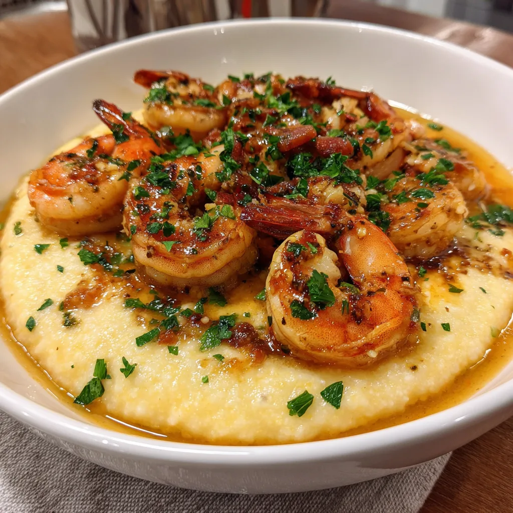 In the same skillet, reduce heat and add garlic. Cook briefly until fragrant, then stir in a small splash of cream and lemon juice to create a light sauce. Return the shrimp to the skillet and toss gently to coat. Serve the shrimp over warm, creamy grits and garnish with fresh parsley.