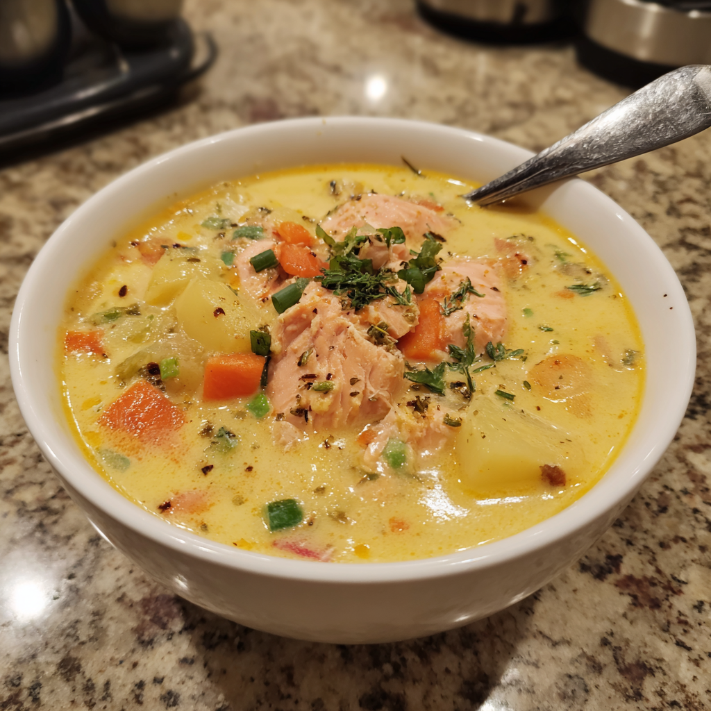 Salmon chowder is one of those timeless comfort dishes that effortlessly blends richness with freshness. Creamy, hearty, and deeply satisfying, it transforms simple ingredients into a luxurious meal suitable for weeknights and special occasions alike. The tender salmon flakes beautifully into the broth while the vegetables provide structure and subtle sweetness. I once tried substituting part of the dairy with unsweetened almond milk, and it worked surprisingly well, giving the chowder a slightly nutty undertone without compromising its velvety texture. This dish fills the kitchen with warmth as it simmers, and its versatility allows you to adapt flavours according to your preferences—whether you like it more herbaceous, spicy, or extra creamy. Its simplicity is part of the charm, proving that wholesome ingredients prepared thoughtfully can result in an extraordinary bowl of comfort.