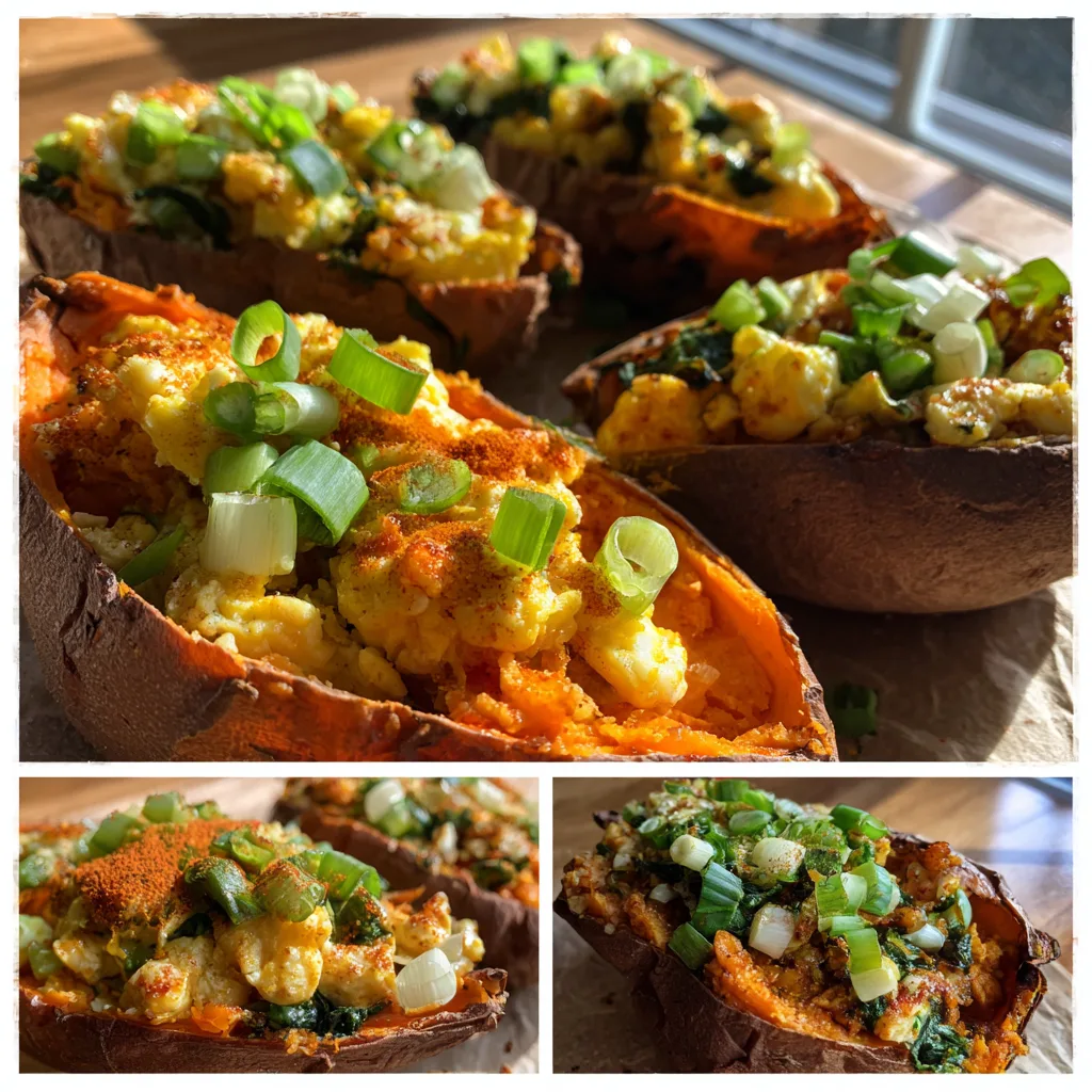 Roasted sweet potatoes stuffed with fluffy scrambled eggs, sautéed vegetables, and melted cheese for a hearty, wholesome breakfast packed with flavor and nutrients.