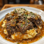 A rich and comforting dish featuring tender, slow-braised beef short rib ragu served over creamy Parmesan mashed potatoes — the ultimate cozy, elegant comfort food for any occasion.