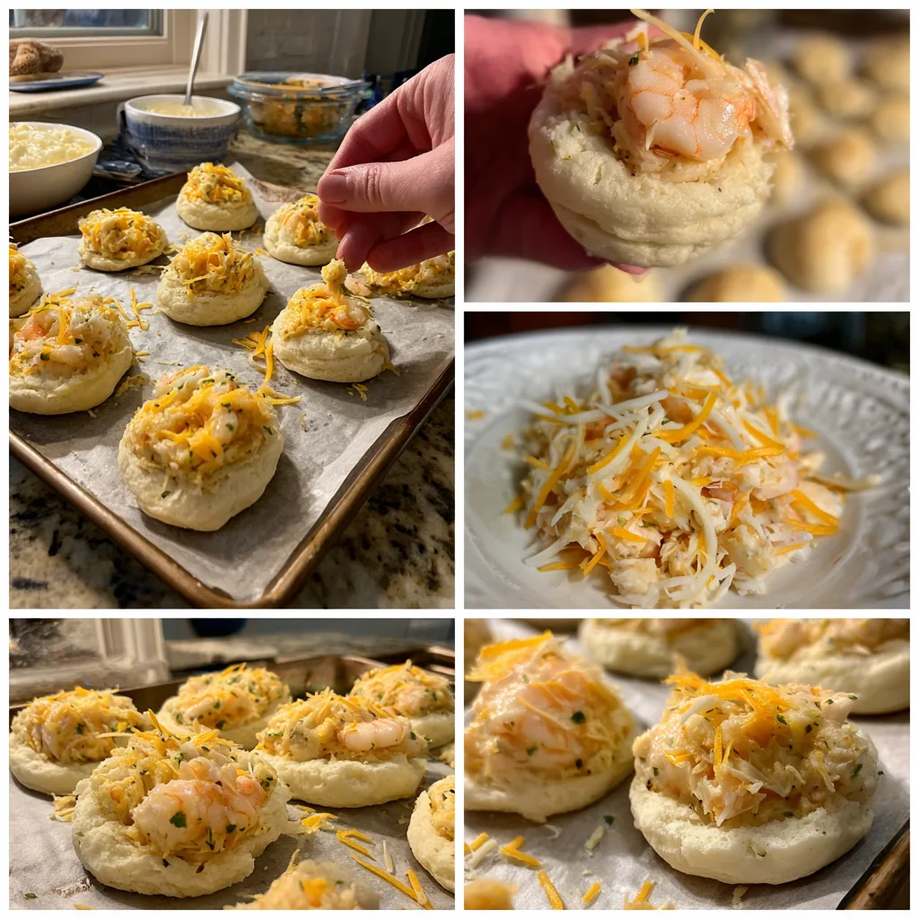 Separate the biscuit dough and flatten each biscuit slightly using your hands. Create a small well in the center of each biscuit and spoon a generous amount of seafood filling into the middle. Carefully bring the edges up slightly to cradle the filling while leaving the top exposed.