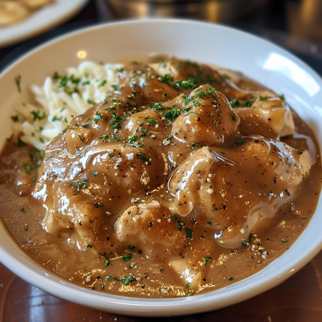 Tender shredded chicken cooked in a rich, savory gravy right in the slow cooker. A comforting, hearty meal perfect for serving over mashed potatoes, rice, or biscuits.