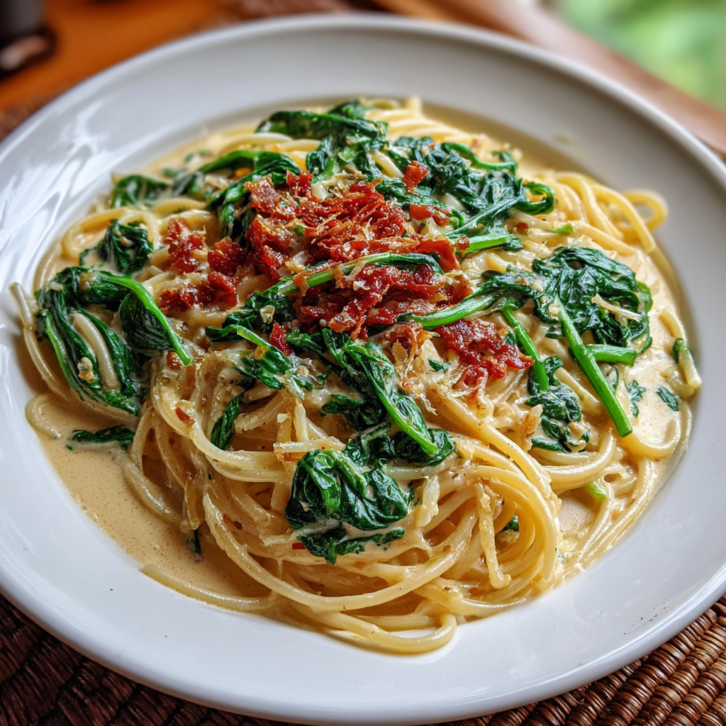 Spaghetti & Spinach with Sun-Dried Tomato Cream Sauce is a creamy, flavorful pasta dish featuring tender spinach and tangy sun-dried tomatoes in a rich Parmesan cream sauce—perfect for a comforting yet elegant meal.