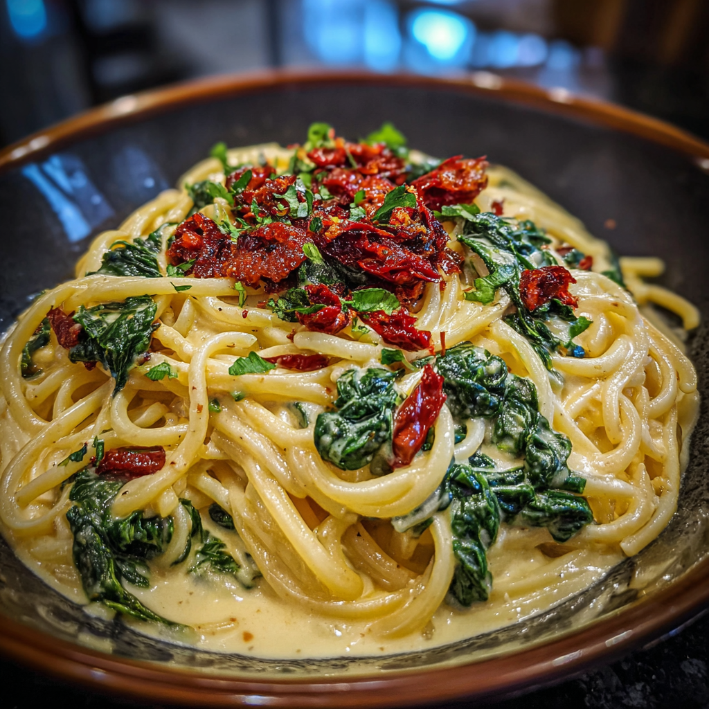This recipe is quick to prepare, rich in flavor, and made with accessible ingredients. The cream sauce is smooth and comforting, while the spinach and sun-dried tomatoes add freshness and contrast. It is a well-balanced pasta dish that feels indulgent without being overwhelming.