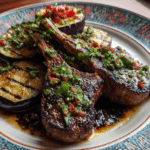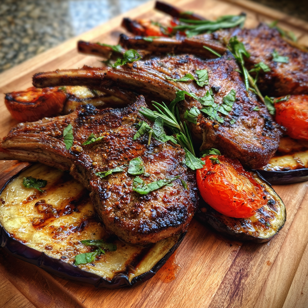 Juicy lamb chops seasoned with aromatic spices, paired with smoky grilled eggplant for a bold and flavorful Mediterranean-inspired dish.
