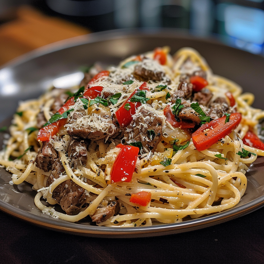 A rich and satisfying pasta dish featuring tender steak slices over creamy Alfredo spaghetti infused with roasted red peppers and Parmesan cheese, offering a luxurious yet comforting meal.