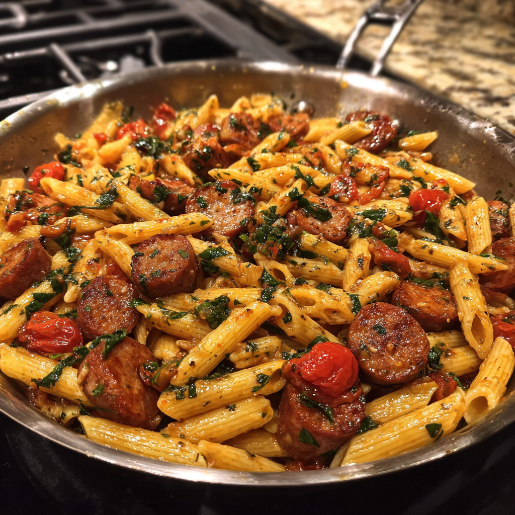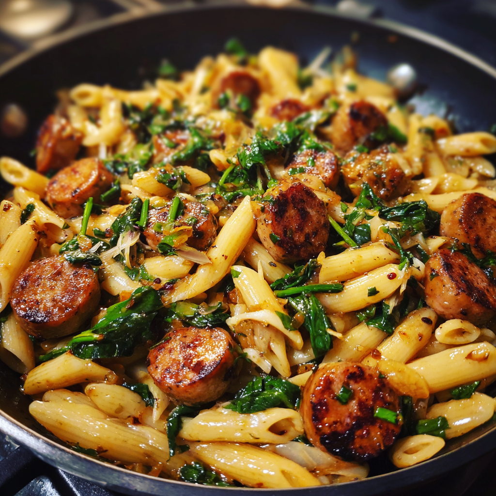 A quick and comforting one-pan pasta dish featuring savory sausage tossed in a sticky honey garlic sauce with tender pasta, perfect for busy weeknights.