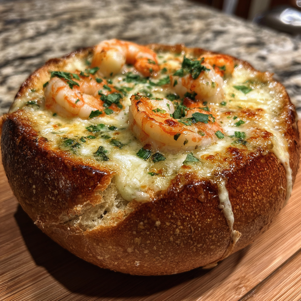 A decadent bread bowl stuffed with a creamy, cheesy seafood filling made with shrimp, crab, and crawfish, baked until golden and bubbling for a crowd-pleasing dish.