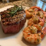 An elegant surf and turf meal featuring tender filet mignon paired with succulent grilled shrimp, finished with a garlic butter sauce for a restaurant-quality dinner at home.