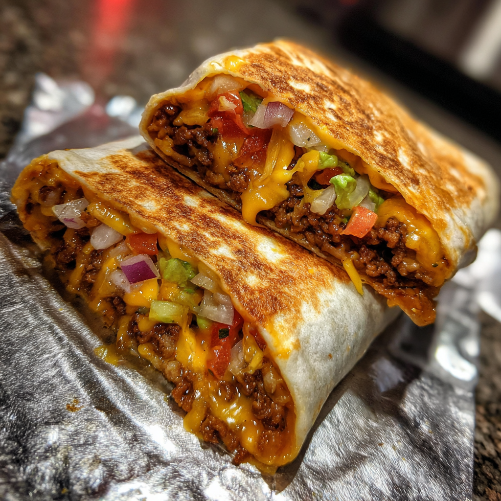 A hearty burrito inspired by Taco Bell’s Beefy Melt, packed with seasoned ground beef, seasoned rice, nacho cheese sauce, and a blend of shredded cheeses, all wrapped in a warm flour tortilla.