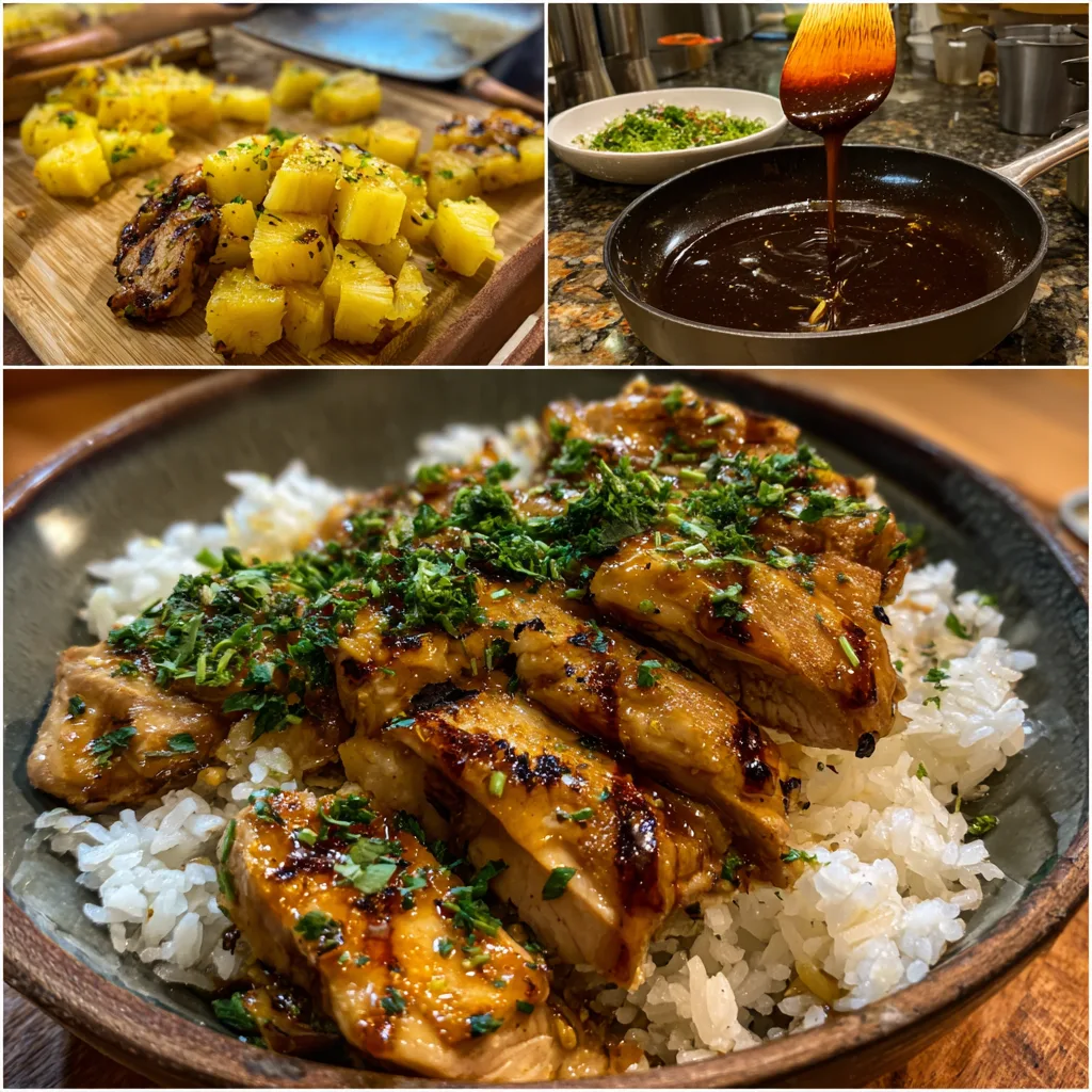 Add the pineapple chunks to the pan and cook for another two to three minutes, just until they are heated through and lightly caramelized. Taste and adjust seasoning if needed. To assemble the bowls, divide the cooked rice between serving bowls, top with the teriyaki chicken and pineapple, and finish with sliced green onions.